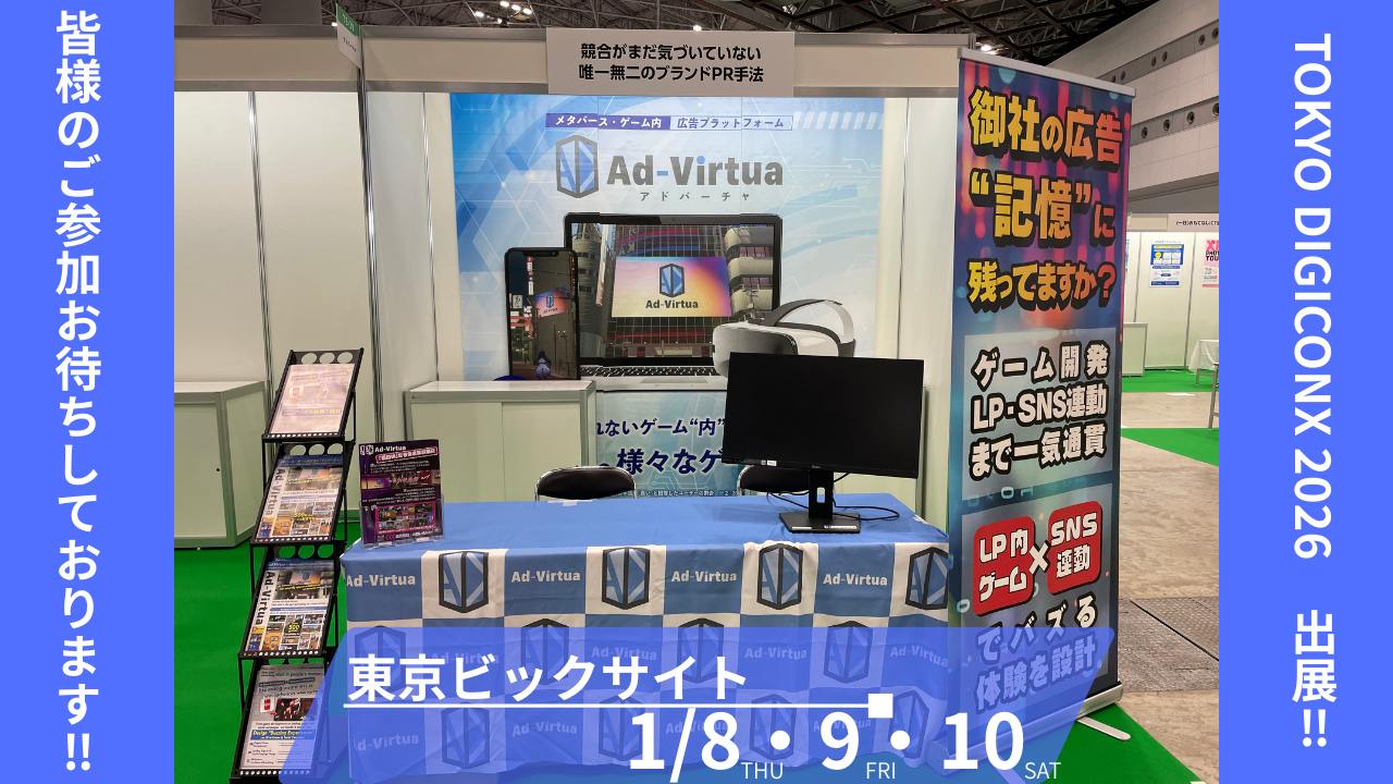 Ad-Virtua Inc. is pleased to announce our participation in TOKYO DIGCONX 2026, a comprehensive exhibition hosted by the Tokyo Metropolitan Government. The event will be held at Tokyo Big Sight from January 8 (Thu) to January 10 (Sat), 2026.